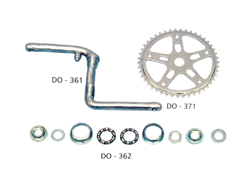 ONE PIECE CRANK - MADE OF SPECIAL FORGED CARBON STEEL BCP, SIZE: 4-1/2" / 5-1/2" THREAD: 1/2" X 20 TPI, DO-362 - B.B.FITTING AMERICAN TYPE FOR OPC SET OF 9 (7 PCS. FITTING + 2 PCS. BALL RETAINER), DO-371 - CHAINWHEEL FOR OPC TEETH: 36/40/44 BCP, FOR CHAIN: 1/2" X 1/8" & 1/2" X 3/32"